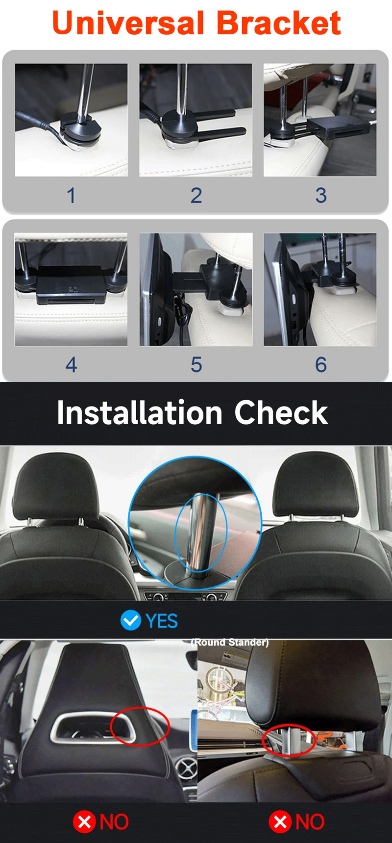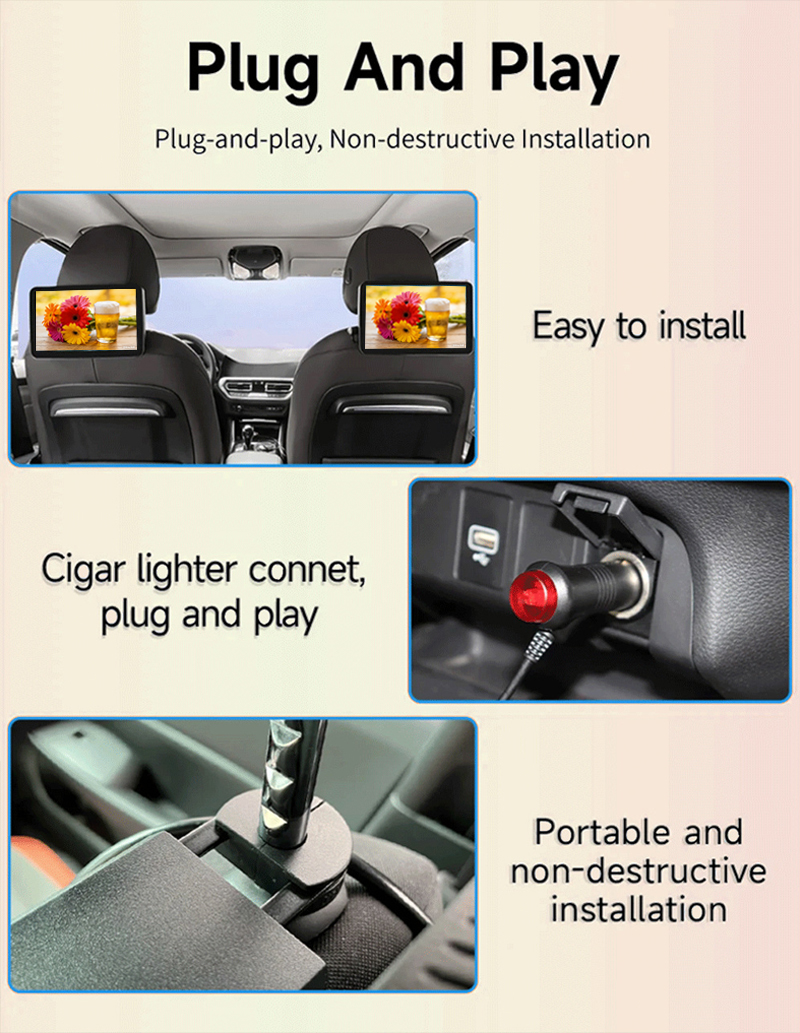 • Universal headrest installation, easy to use, suitable for most vehicle models